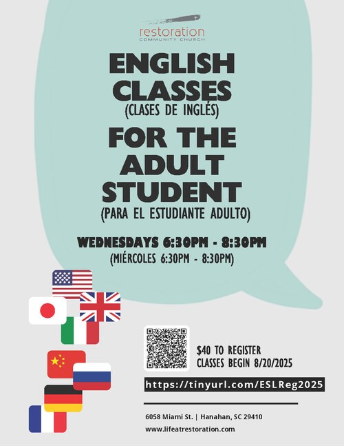 Las clases de ESL (inglés como segundo lenguaje) se ofrecen los miércoles por la noche de 6:30 a 8:30 p.m. Estas clases te enseñarán a hablar y comunicarte en inglés. Los nuevos semestres comienzan cada primavera y otoño. Ofrecemos cenas todas las semanas e incluso tenemos cuidado de niños disponible si necesita traer a sus hijos con usted. El precio/costo de la clase es $40 para cubrir el precio de sus libros. Póngase en contacto con Katie Spurlock por correo electrónico a katie@lifeatrestoration.com si tiene alguna pregunta o desea inscribirse en la clase"